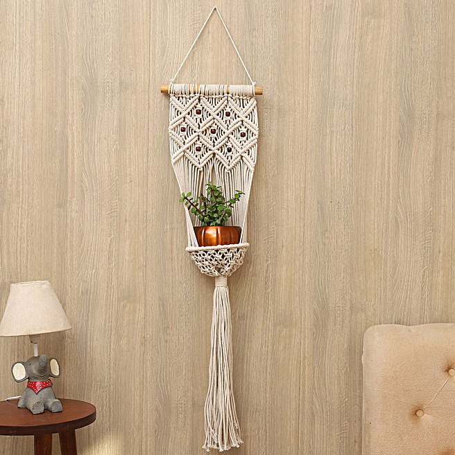 Jade Plant With Beige Beaded Hanging Planter