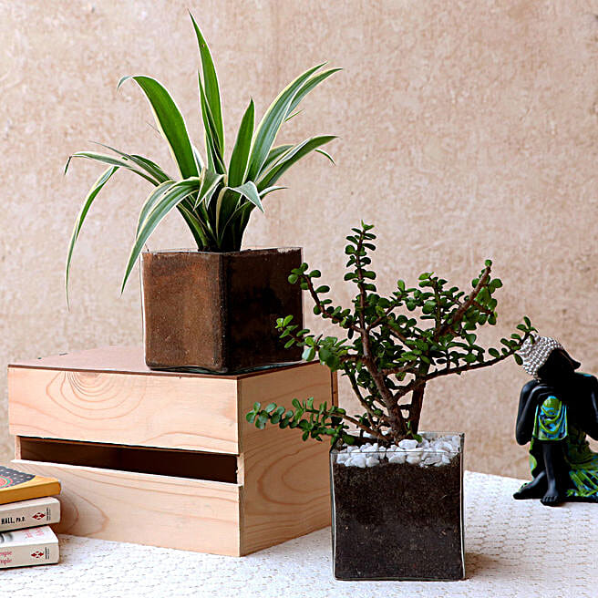 Jade & Spider Plant In Glass Square Vase