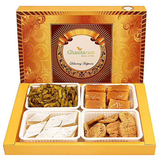 Kaju Katli, Mysore Pak, Methi Mathi & Potato Palak Chips Box