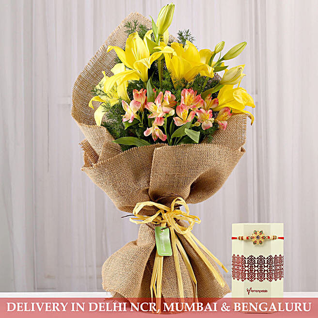 Lilies & Alstroemeria Bouquet With Meenakari Rakhi