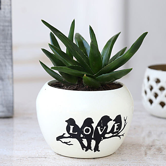 Mini Aloe Vera Plant In Love Birds White Metal Pot