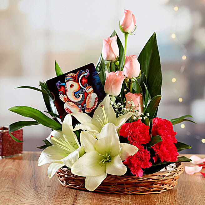 Mixed Flowers Arrangement In Basket With Table Top