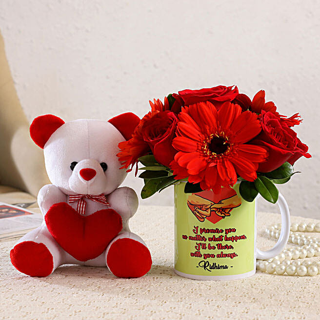 Mixed Flowers Arrangement In Personalised Mug and Cute Teddy