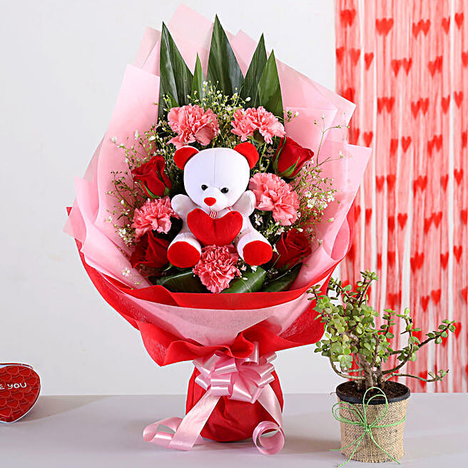 Mixed Flowers Bouquet With Teddy & Jade Plant
