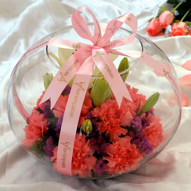 Mixed Flowers In Beautiful Ribbon Tied Fish Bowl