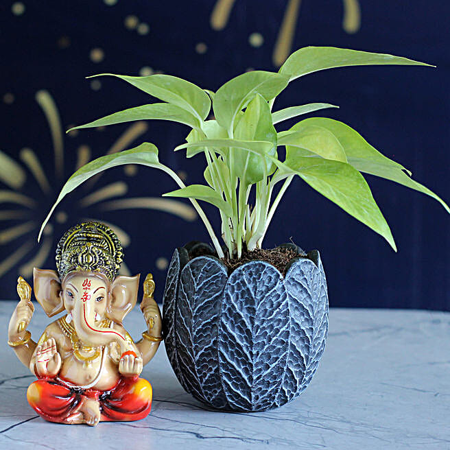 Money Plant Ceramic Pot & Red Dhoti Ganesha Idol