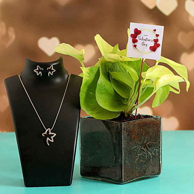 Money Plant In Glass Vase With V Day Tag and Jewellery Set