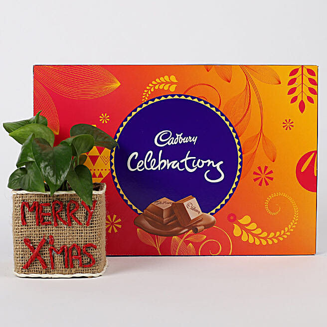 Money Plant in Merry Xmas Glass Vase & Cadbury Celebrations Box