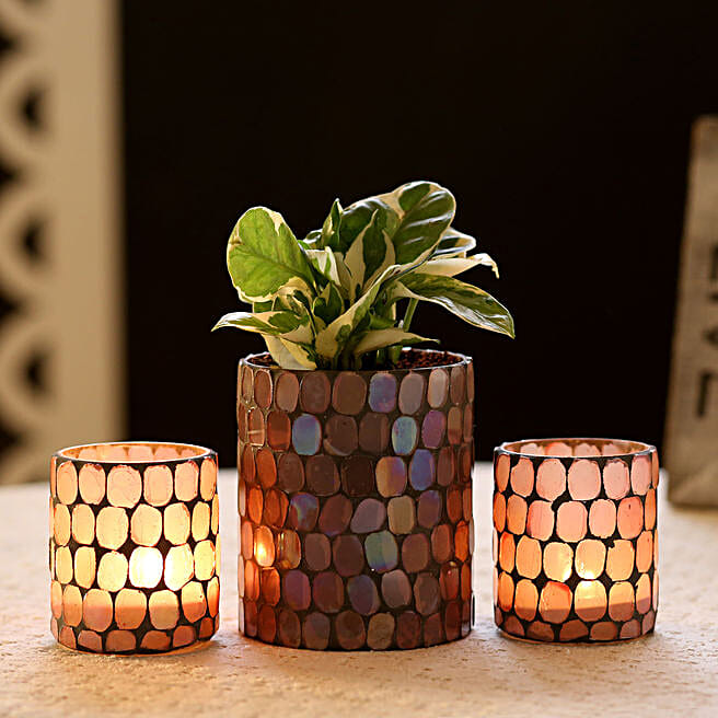 N'Joy Money Plant In Mosaic Art Pot & 2 Votive Holders