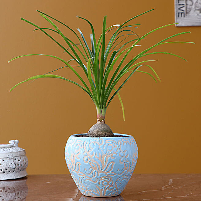 Nolina Palm Plant In Sky Blue Ceramic Pot