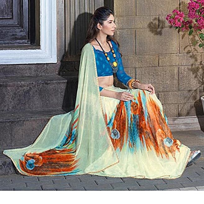 Off White Chiffon Traditional Printed Saree