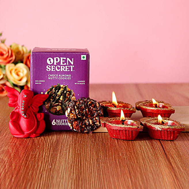 Open Secret Almond Cookies & Red Ganesha Idol With Diyas