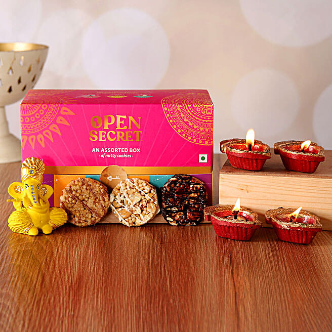 Open Secret Assorted Cookies With Flute Ganesha Idol & Diyas