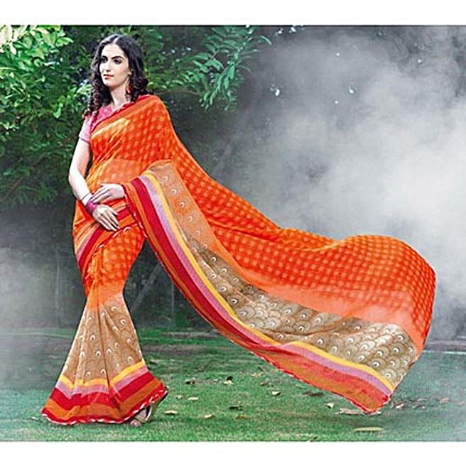 Orange Chiffon Printed Casual Wear Saree