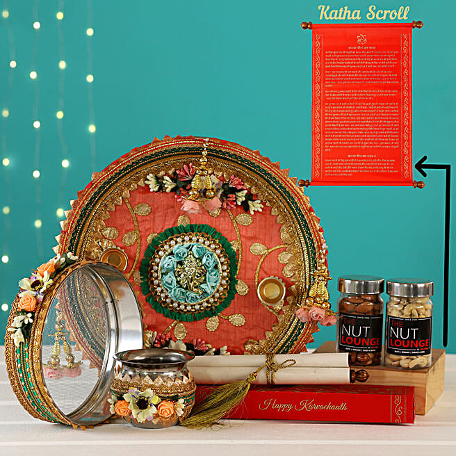 Peach Karwa Chauth Thali Hamper With Nuts & Katha Scroll