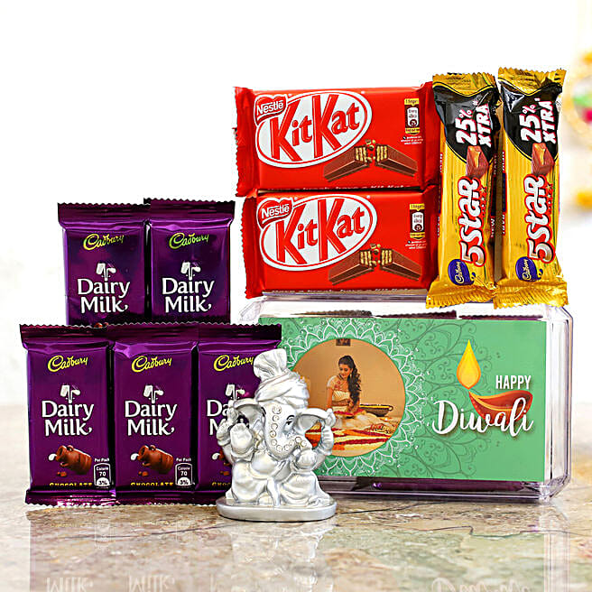 Personalised Green Diwali Box & Silver Ganesha Idol With Chocolates