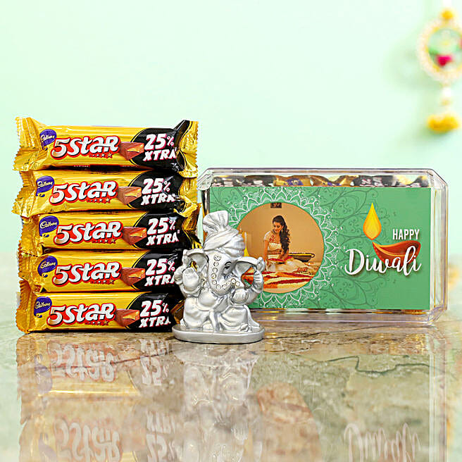 Personalised Green Diwali Box With Silver Ganesha Idol & Cadbury 5 Star Combo