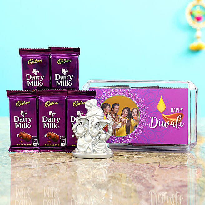 Personalised Purple Diwali Box With Silver Ganesha Idol & Dairy Milk