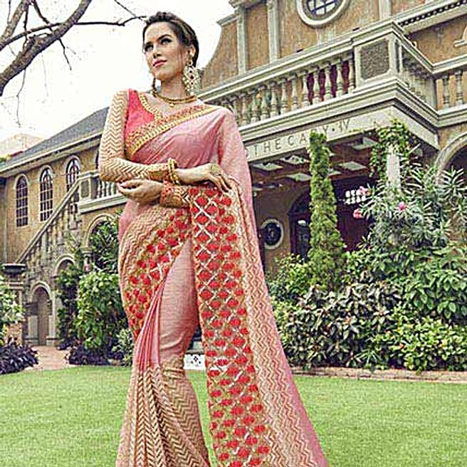 Pink Chiffon Net Traditional Embroidered Partywear Saree