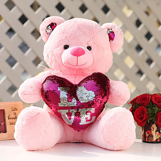 Pink Color Sequin Love Teddy Bear