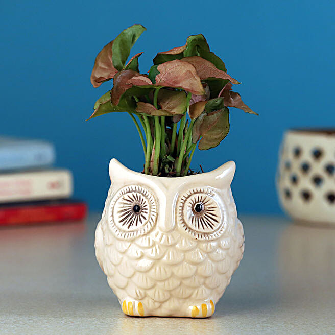 Pink Syngonium Plant In White Owl Ceramic Pot