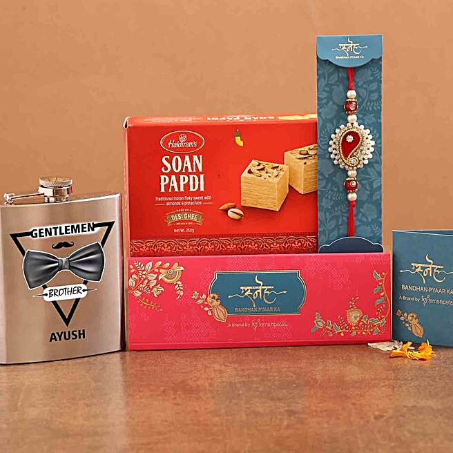 Premium Pearl Rakhi With Soan Papdi & Personalised Flask