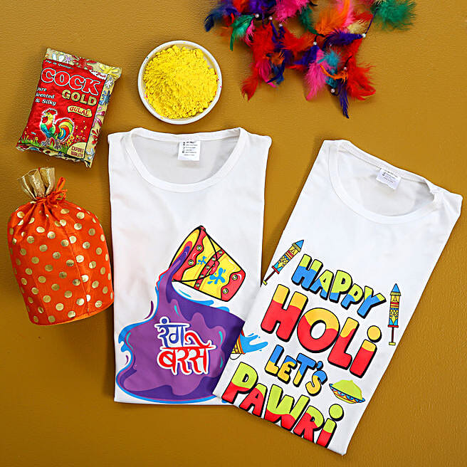 Printed Holi Medium & XL Set of 2 T shirts with Gulal