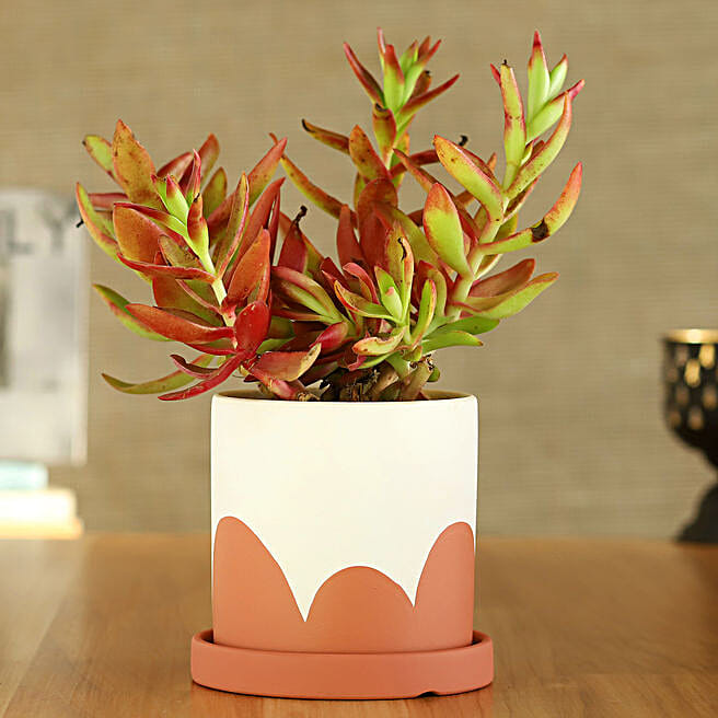 Red Campfire Plant In Coral & Green Pot With Plate