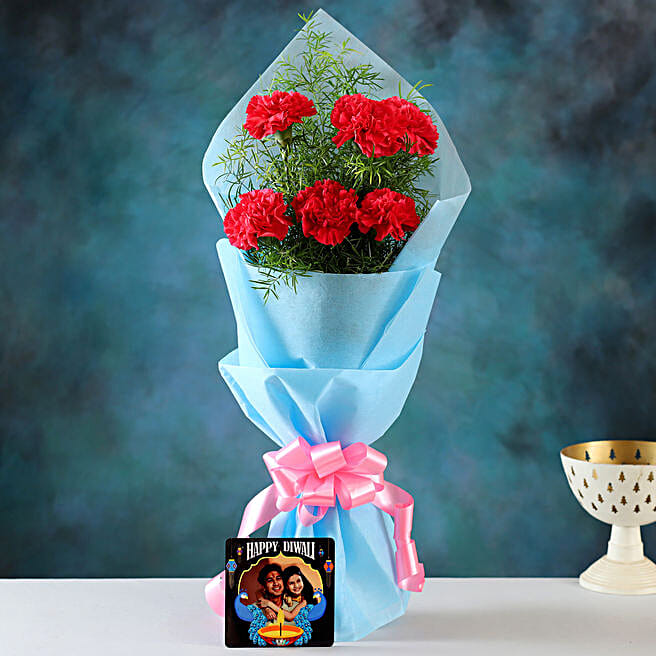 Red Carnations & Personalised Diwali Cushion