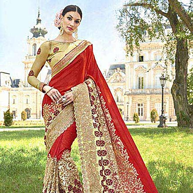 Red Net Georgette Traditional Embroidered Saree