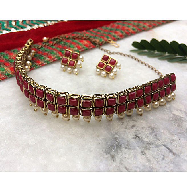 Paya Red Resin and Pearl Choker Necklace Set