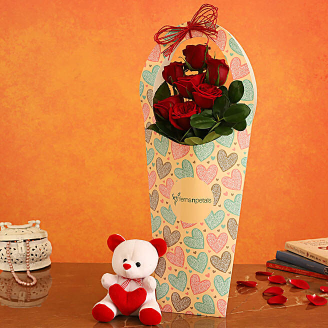 Red Roses In FNP Heart Sleeve and Cute Teddy