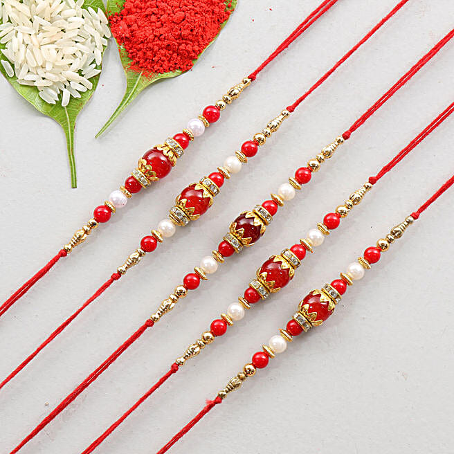 Red & White Beads Family Rakhi- Set Of 5