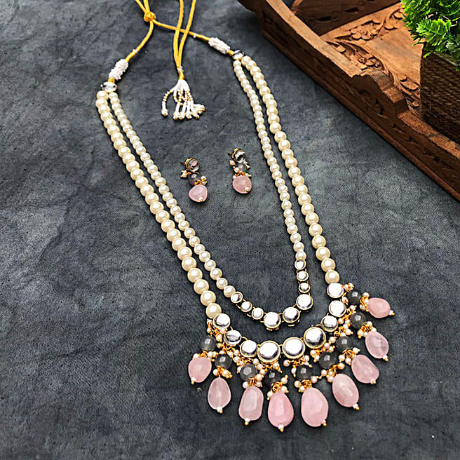 Paya Rose Quartz and Kundan Long Layered Necklace Set