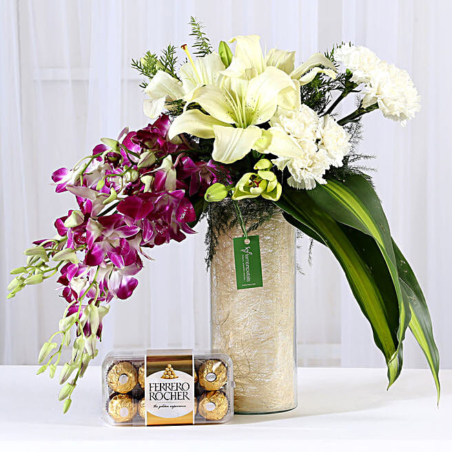Orchids & Carnations With Ferrero Rocher- 16 Pcs