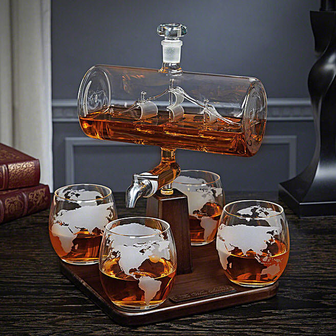 Sailing Ship Whiskey Decanter Set With 4 Globe Glasses