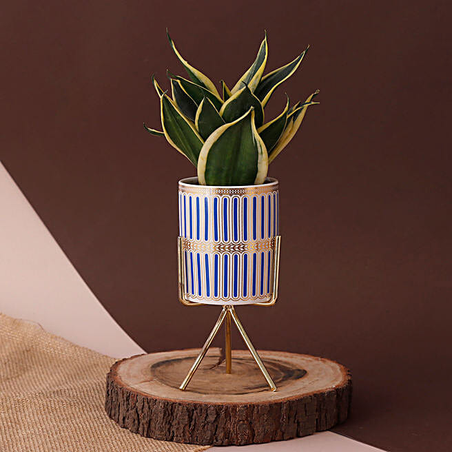 Sansevieria Plant Blue N Golden Pot With Stand