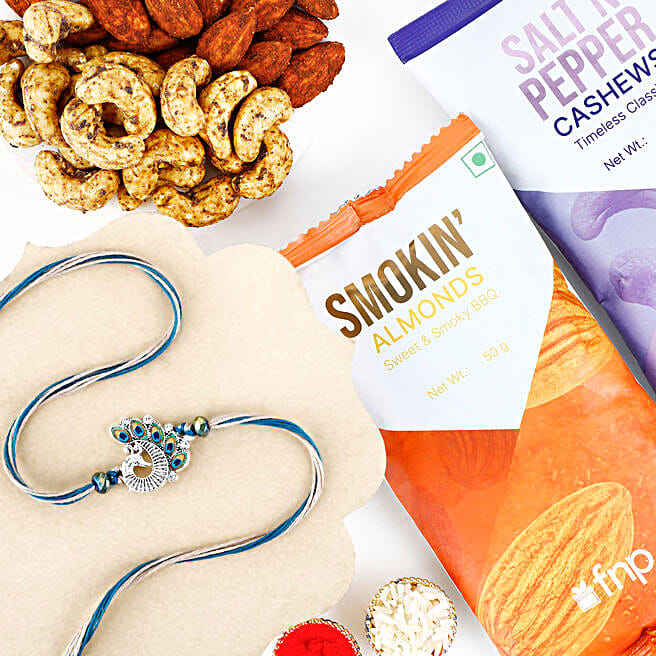 Sapphire Serenity Peacock Rakhi & Nuts Combo