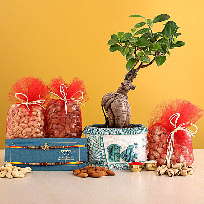 Set of 2 Holy Rakhi & Ficus Bonsai Pot With Dry Fruits