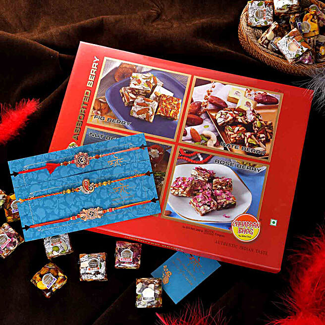 Set of 3 Om & Ganesha Rakhis With Assorted Berry Bites