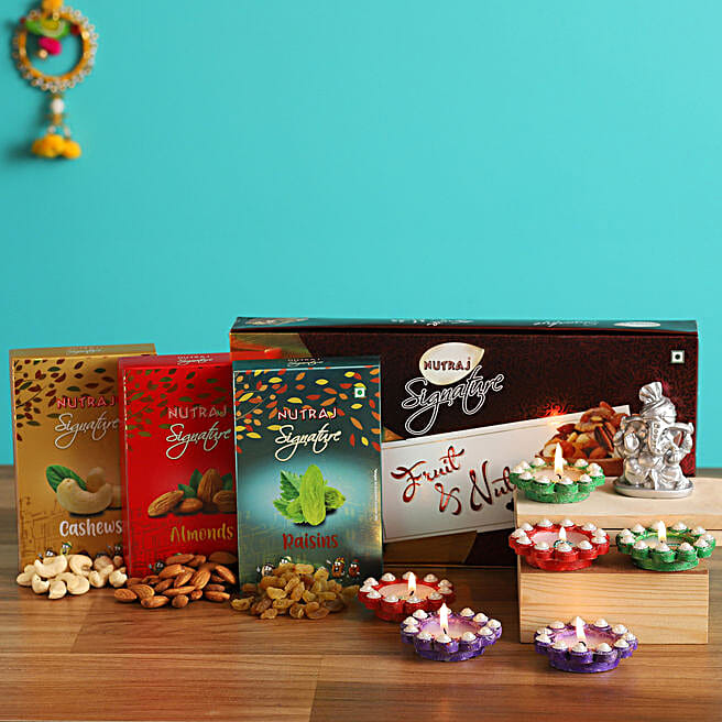 Silver Ganesha Idol & Dry Fruits Box With Diyas