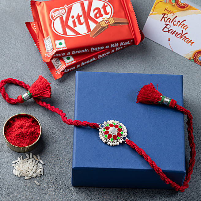 Silver Kundan Rakhi N Kitkat Chocolate Combo