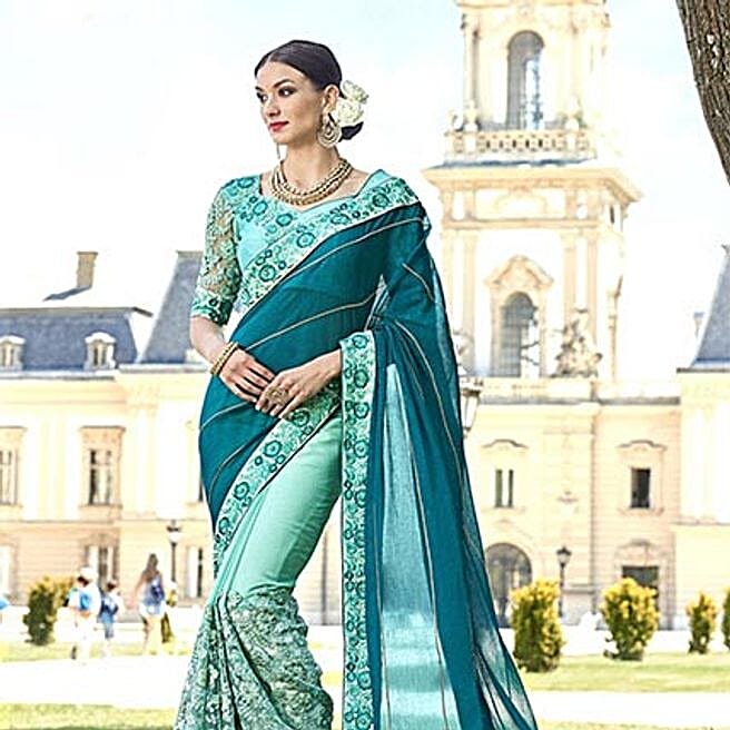 SkyBlue Chiffon Net Half N Half Embroidered Saree