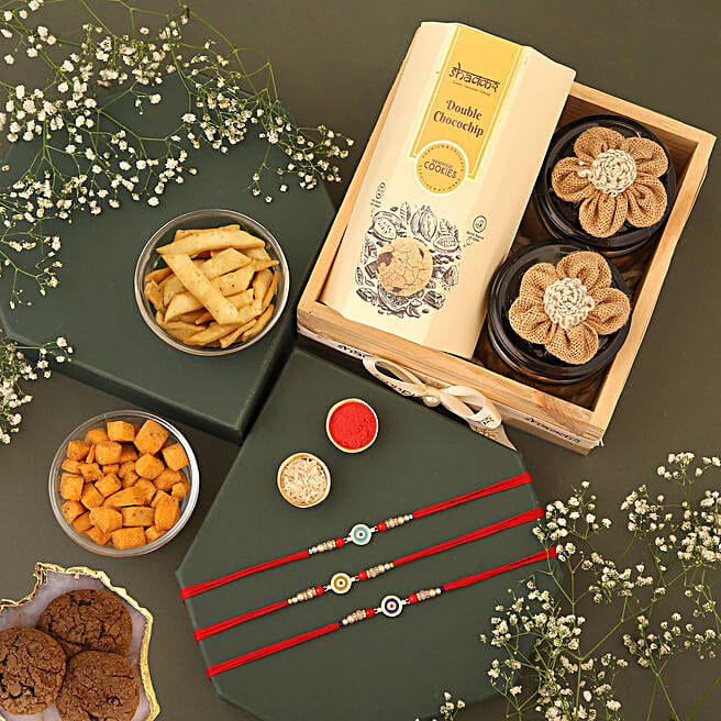 Shakkar Evil Eye Phiroza Rakhi Set With Cookies Savouries