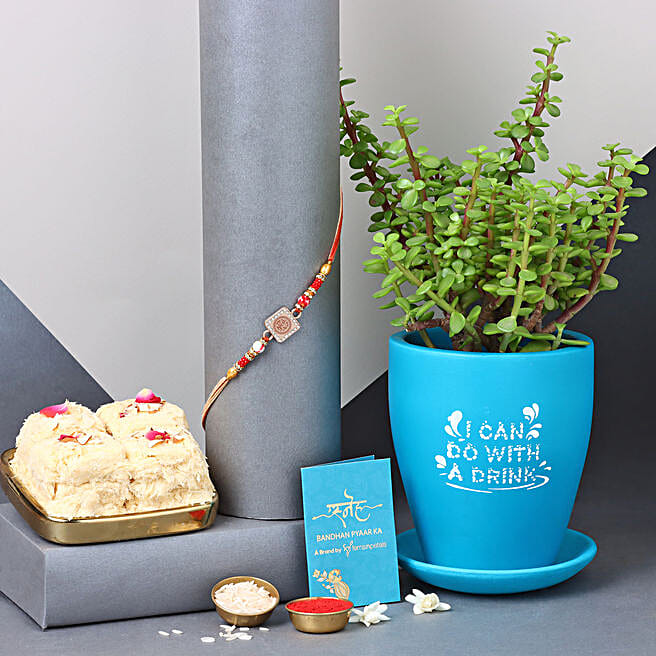 Meenakari Rakhi & Jade Plant With Soan Papdi