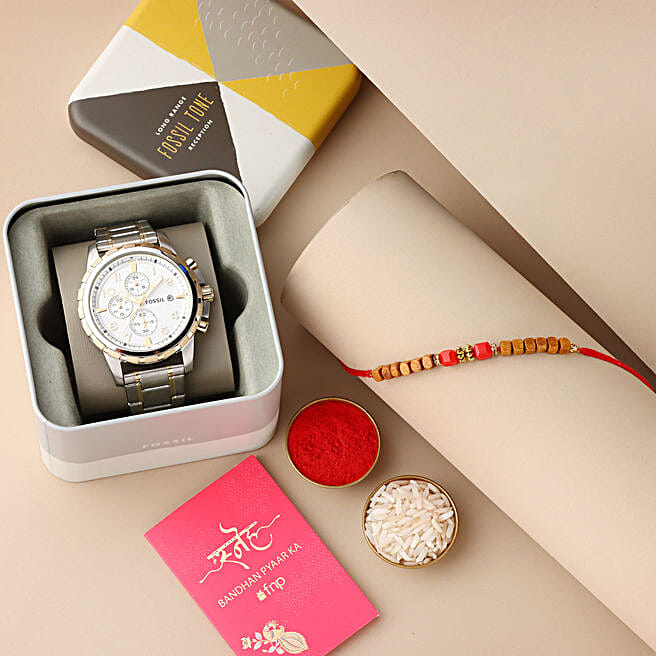 Multi-Colour Beads Rakhi with Fossil Analog Men's Watch