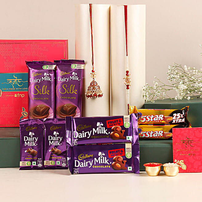 Red & White Beads Bhaiya Bhabhi Rakhi Set & Cadbury Chocolates Hamper