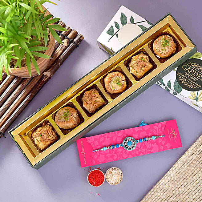 Sea Blue Stone & Beads Rakhi With Baklava Tray