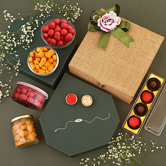 Shakkar Swastik Bracelet Silver Rakhi With Chocolates Dryfruits Hamper