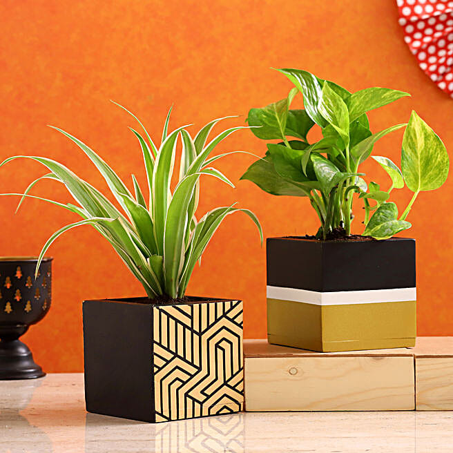 Spider Plant & Money Plant Combo In Mango Wood Planters